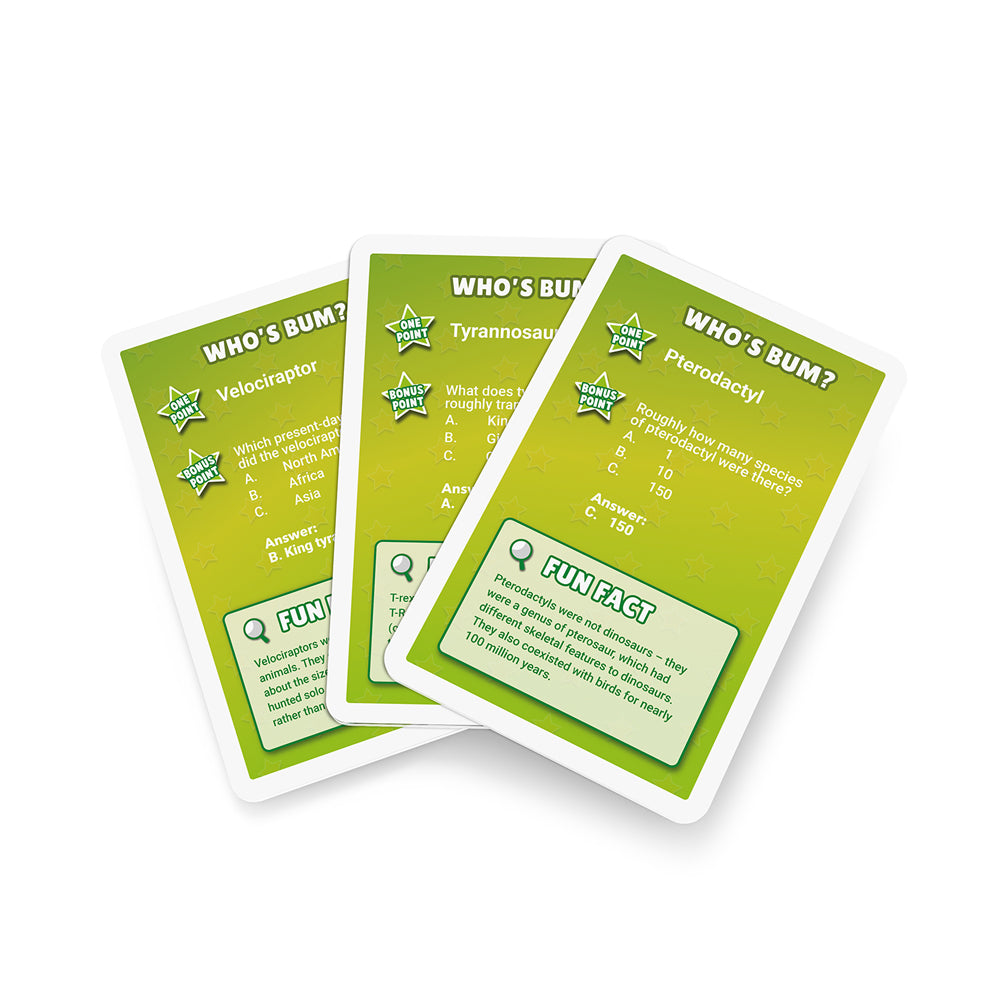Can players name the dinosaur from the derriere? Name That Bumhole: Dino Edition is a Jur-ASS-ic take on our original bestseller, Name That Bumhole. We've ASSembled a prehistoric parade of 55 reptile rumps complete with trivia and fun facts. The result? The most hilarious BUTT education game on big lizards you're likely to find!